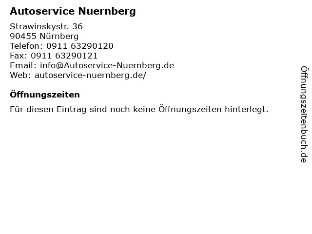 | Öffnungszeiten Autoservice Nuernberg in Nürnberg anzeigen | |