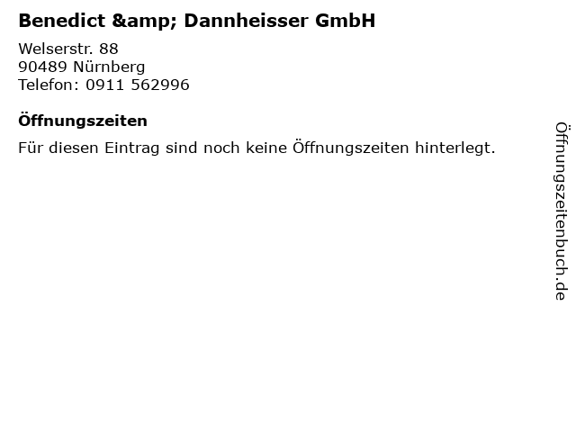 | Öffnungszeiten Benedict & Dannheisser GmbH in Nürnberg anzeigen | |