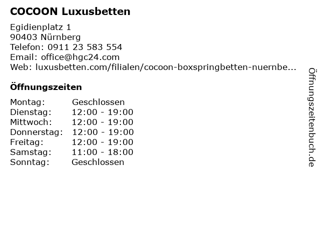 Öffnungszeiten COCOON Luxusbetten in Nürnberg anzeigen | |