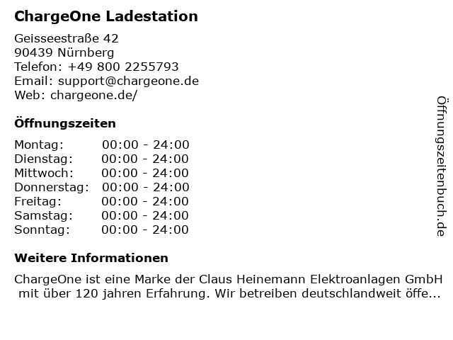 | Öffnungszeiten ChargeOne Ladestation in Nürnberg anzeigen | |