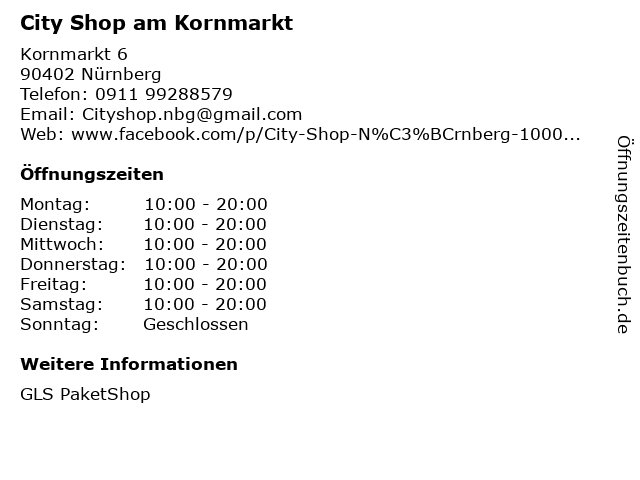 | Öffnungszeiten City Shop am Kornmarkt in Nürnberg anzeigen | |