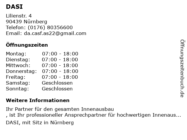 | Öffnungszeiten DASI in Nürnberg anzeigen | |