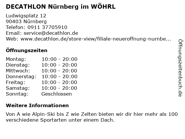 | Öffnungszeiten DECATHLON Nürnberg im WÖHRL in Nürnberg anzeigen | |