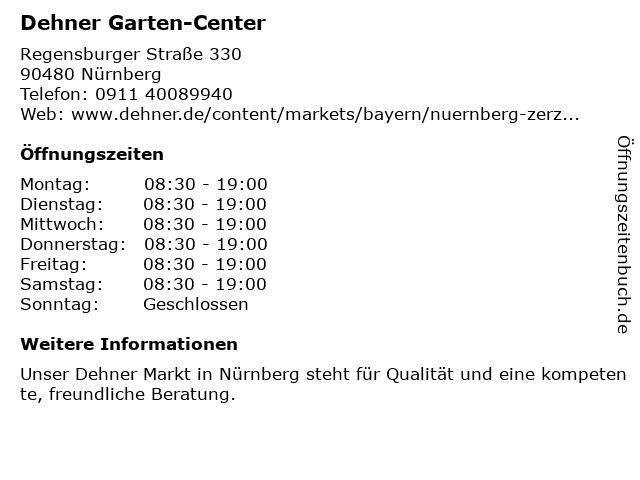 | Öffnungszeiten Dehner Garten-Center in Nürnberg anzeigen | |
