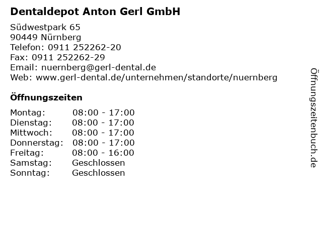 | Öffnungszeiten Dentaldepot Anton Gerl GmbH in Nürnberg anzeigen | |