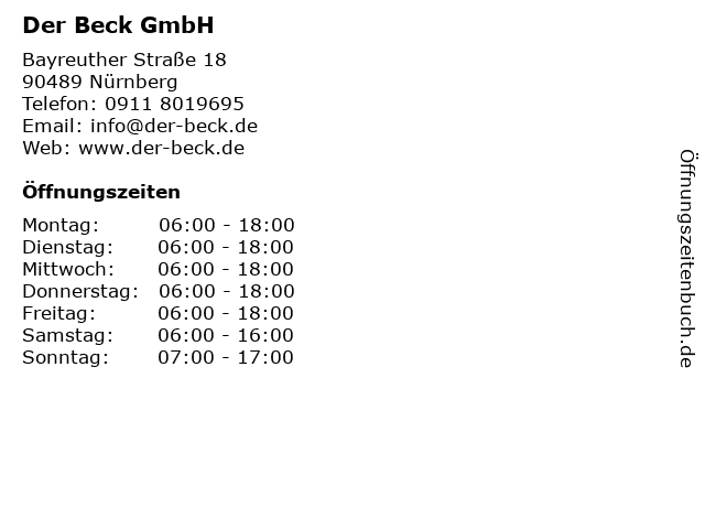 | Öffnungszeiten Der Beck GmbH in Nürnberg anzeigen | |
