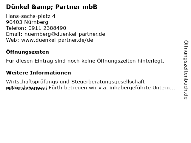 | Öffnungszeiten Dünkel & Partner mbB in Nürnberg anzeigen | |
