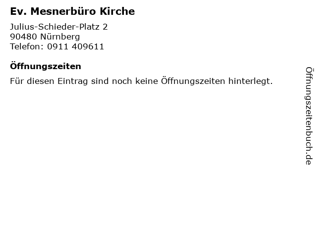 | Öffnungszeiten Ev. Mesnerbüro Kirche in Nürnberg anzeigen | |