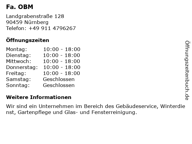 | Öffnungszeiten Fa. OBM in Nürnberg anzeigen | |