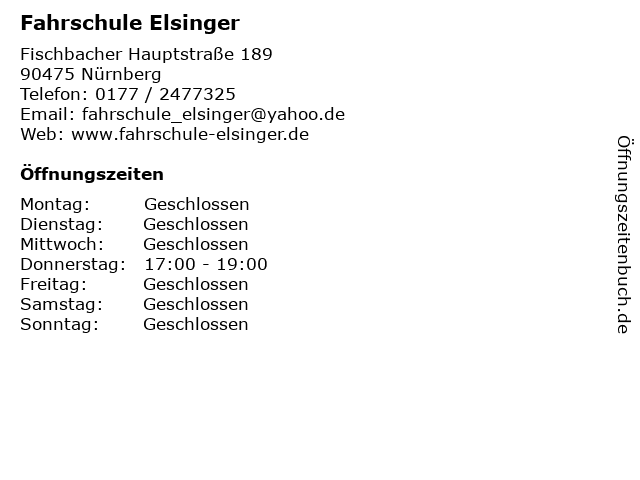 | Öffnungszeiten Fahrschule Elsinger in Nürnberg anzeigen | |