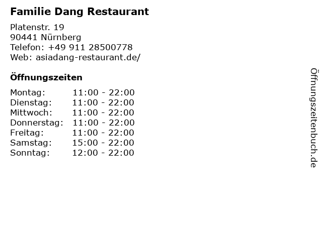 | Öffnungszeiten Familie Dang Restaurant in Nürnberg anzeigen | |