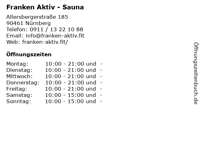 Öffnungszeiten Franken Aktiv - Sauna in Nürnberg anzeigen | |