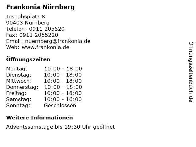 | Öffnungszeiten Frankonia Nürnberg in Nürnberg anzeigen | |
