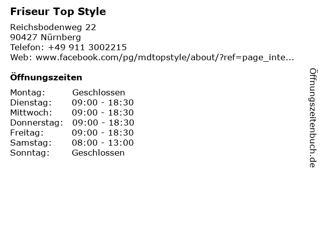| Öffnungszeiten Friseur Top Style in Nürnberg anzeigen | |
