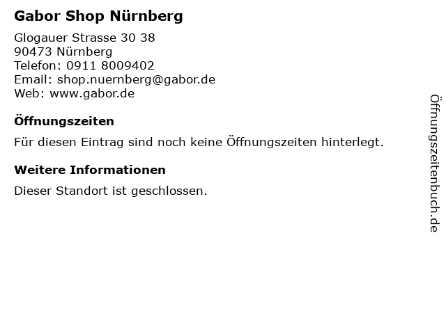 | Öffnungszeiten Gabor Shop Nürnberg in Nürnberg anzeigen | |