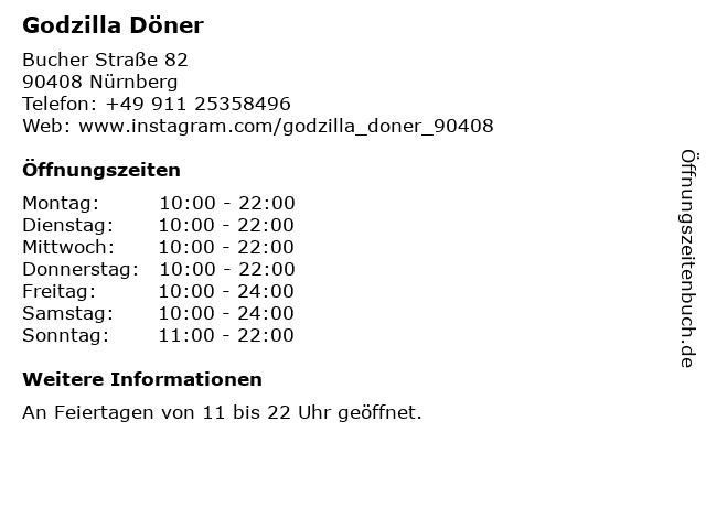 | Öffnungszeiten Godzilla Döner in Nürnberg anzeigen | |