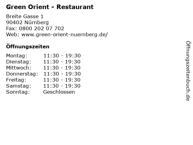 | Öffnungszeiten Green Orient - Restaurant in Nürnberg anzeigen | |