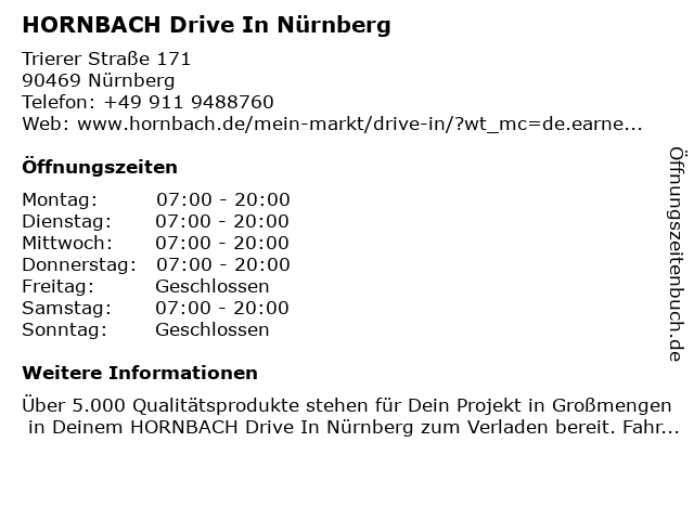 Öffnungszeiten HORNBACH Drive In Nürnberg in Nürnberg anzeigen | |