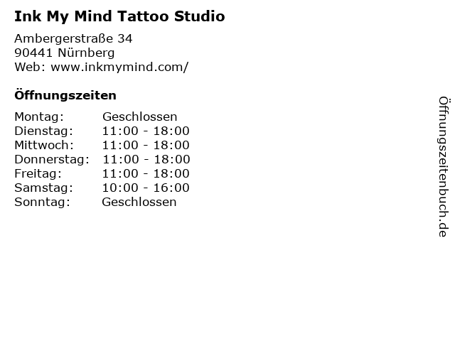 | Öffnungszeiten Ink My Mind Tattoo Studio in Nürnberg anzeigen | |