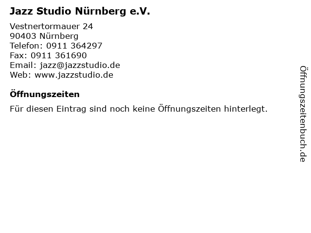 | Öffnungszeiten Jazz Studio Nürnberg e.V. in Nürnberg anzeigen | |