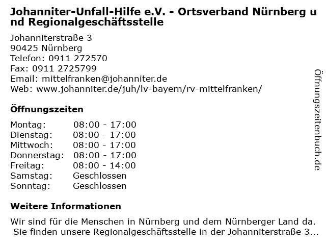 1 Johanniter-Unfall-Hilfe e.V. - Rettungswache Nürnberg (Entfernung: 0,03 km) Johanniterstraße 3, 90425 Nürnberg 2 Johanniter-Unfall-Hilfe e.V. - Regionalverband Mittelfranken (Entfernung: 0,03 km) Johanniterstraße 3, 90425 Nürnberg 3 Johanniter-Akademie Bayern - Campus Nürnberg (Entfernung: 0,04 km) Johanniterstraße 3, 90425 Nürnberg 6 |