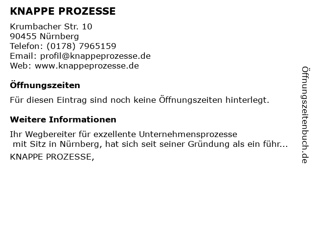 Öffnungszeiten KNAPPE PROZESSE in Nürnberg anzeigen | |