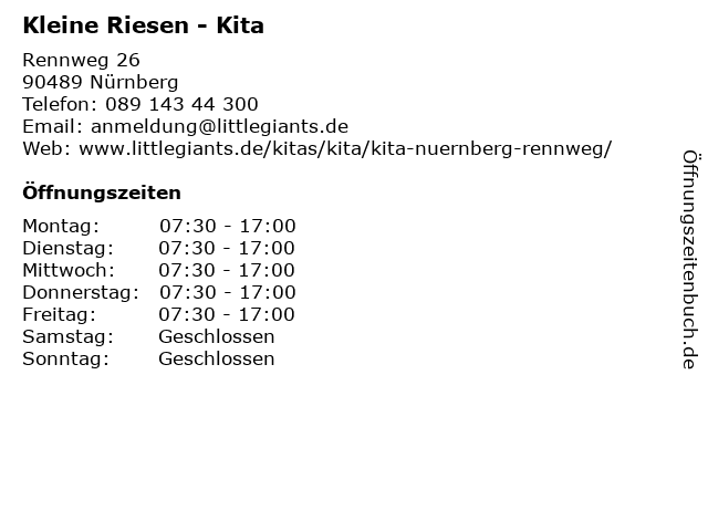 | Öffnungszeiten Kleine Riesen - Kita in Nürnberg anzeigen | |
