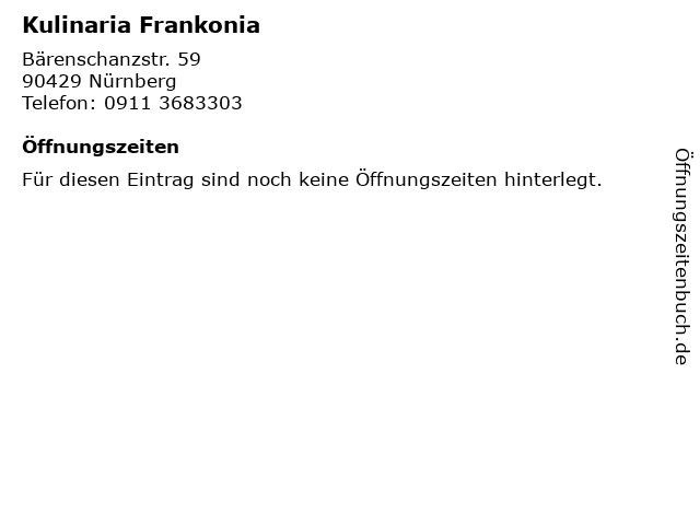 | Öffnungszeiten Kulinaria Frankonia in Nürnberg anzeigen | |