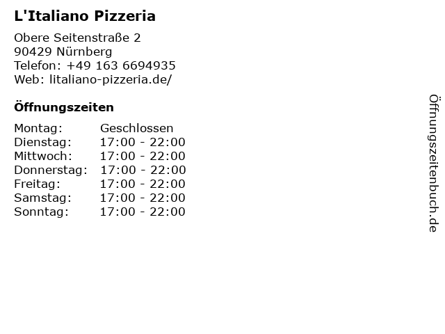 | Öffnungszeiten L'Italiano Pizzeria in Nürnberg anzeigen | |