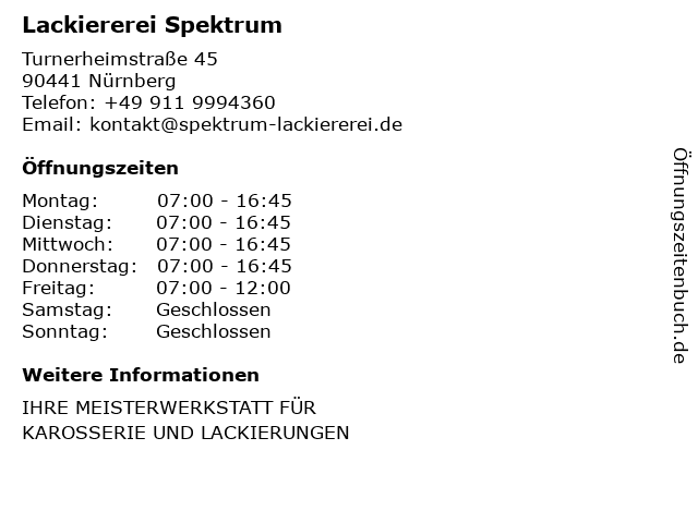 | Öffnungszeiten Lackiererei Spektrum in Nürnberg anzeigen | |