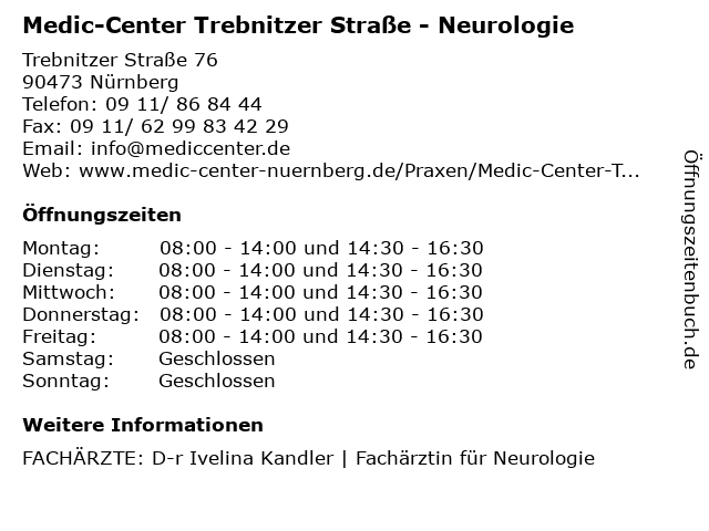 1 Medic-Center Trebnitzer Straße – Allgemeinmedzin (Entfernung: 0,00 km) Trebnitzer Str. 76, 90473 Nürnberg 2 5 Medic-Center Franken-Center - Barbara Stepowski-Legominski (Fachärztin für Physikalische und Rehabilitative Medizin, Chirotherapie, Akupunktur) (Entfernung: 0,56 km) Glogauer Straße 42, 90473 Nürnberg 6 |