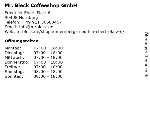 | Öffnungszeiten Mr. Bleck Coffeeshop GmbH in Nürnberg anzeigen | |