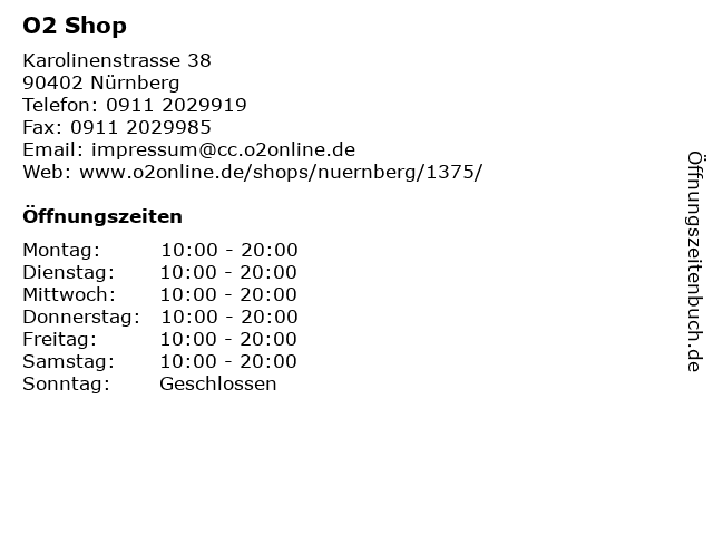 | Öffnungszeiten O2 Shop in Nürnberg anzeigen | |