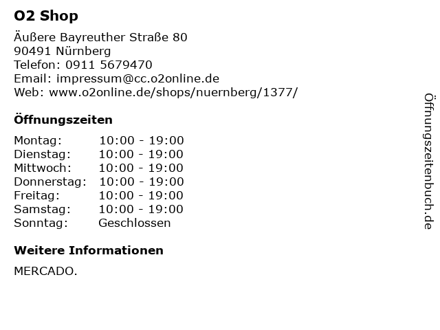 | Öffnungszeiten O2 Shop in Nürnberg anzeigen | |
