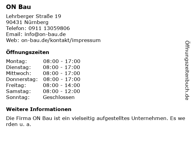 | Öffnungszeiten ON Bau in Nürnberg anzeigen | |