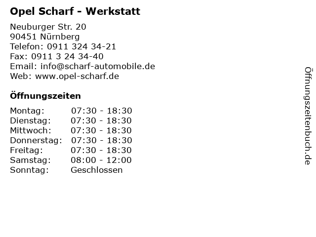 | Öffnungszeiten Opel Scharf - Werkstatt in Nürnberg anzeigen | |