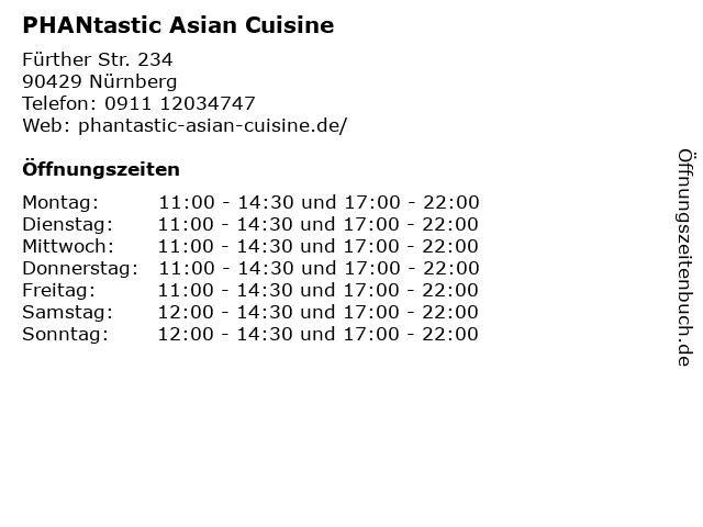 | Öffnungszeiten PHANtastic Asian Cuisine in Nürnberg anzeigen | |