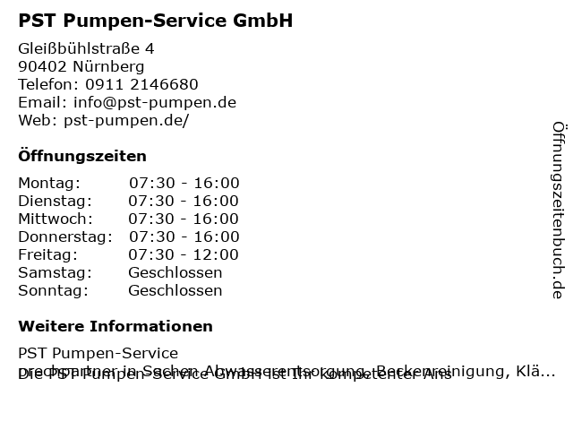 | Öffnungszeiten PST Pumpen-Service GmbH in Nürnberg anzeigen | |
