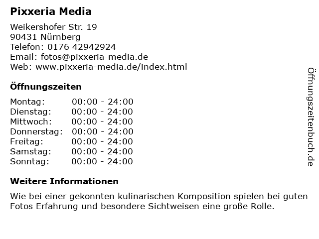 | Öffnungszeiten Pixxeria Media in Nürnberg anzeigen | |