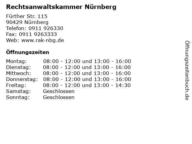 | Öffnungszeiten Rechtsanwaltskammer Nürnberg in Nürnberg anzeigen | |