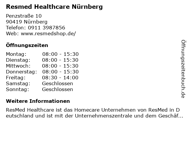 | Öffnungszeiten Resmed Healthcare Nürnberg in Nürnberg anzeigen | |