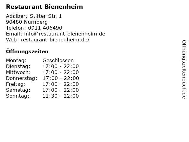 Öffnungszeiten Restaurant Bienenheim in Nürnberg anzeigen | |