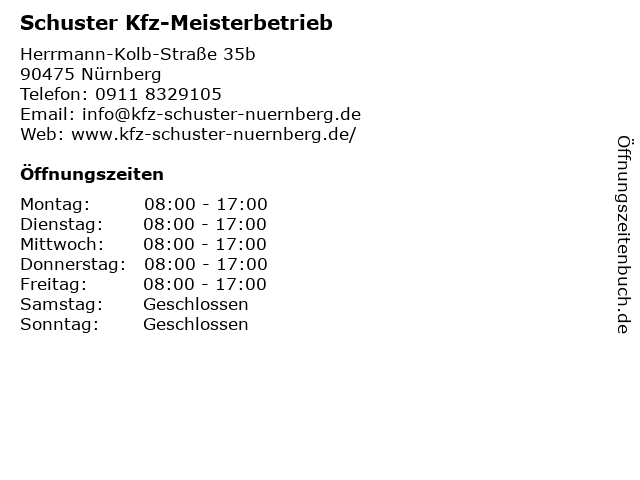 | Öffnungszeiten Schuster Kfz-Meisterbetrieb in Nürnberg anzeigen | |