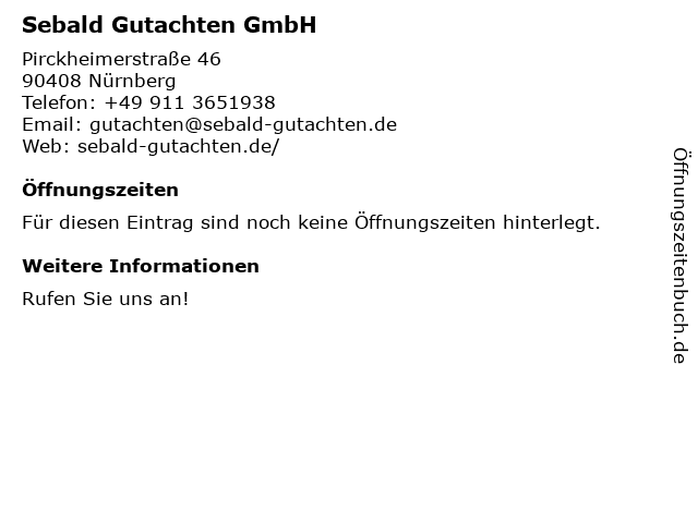 | Öffnungszeiten Sebald Gutachten GmbH in Nürnberg anzeigen | |