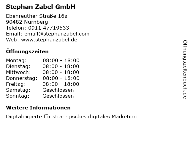 | Öffnungszeiten Stephan Zabel GmbH in Nürnberg anzeigen | |
