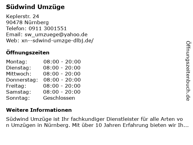 | Öffnungszeiten Südwind Umzüge in Nürnberg anzeigen | |