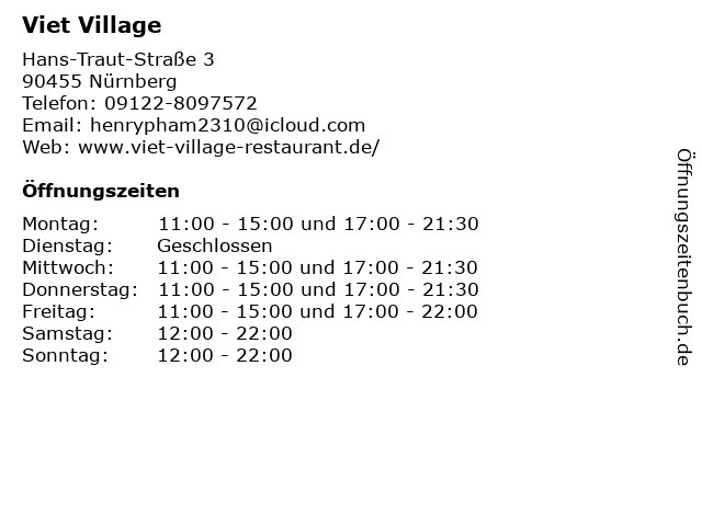 | Öffnungszeiten Viet Village in Nürnberg anzeigen | |