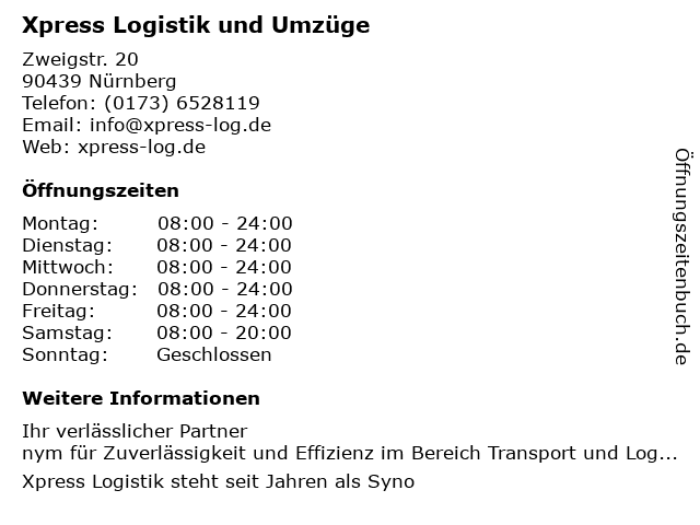 | Öffnungszeiten Xpress Logistik und Umzüge in Nürnberg anzeigen | |