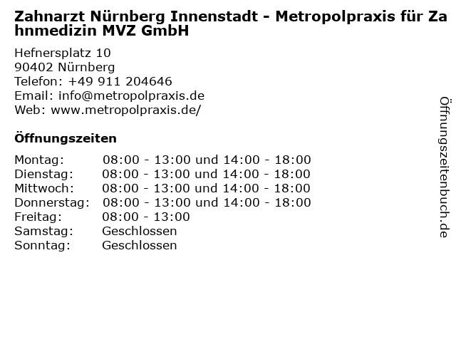 1 Zahnarzt Nürnberg Innenstadt - Metropolpraxis für Zahnmedizin MVZ GmbH (Entfernung: 0,01 km) Hefnersplatz 10, 90402 Nürnberg 2 Metropolklinik Praxisklinik für innovative Zahnmedizin (Entfernung: 0,01 km) Hefnersplatz 10, 90402 Nürnberg 3 Zahnärztliche Tagesklinik Überörtliche Berufsausübungsgemeinschaft Dr. Eichenseer MVZ GmbH (Entfernung: 0,12 km) Karolinenstraße 43-45, 90402 Nürnberg 4 MVZ Med. Versorgungszentrum Gefäßmedizin Nürnberg (Entfernung: 0,53 km) Obere Turnstr. 8 -10, 90429 Nürnberg 6 BDT-MVZ-Träger GmbH Institut für bildgebende Diagnostik und Therapie (Entfernung: 1,45 km) Prof..-Ernst-Nathan-Straße 1, 90419 Nürnberg |