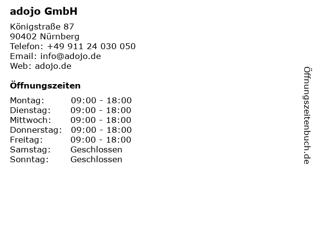 | Öffnungszeiten adojo GmbH in Nürnberg anzeigen | |